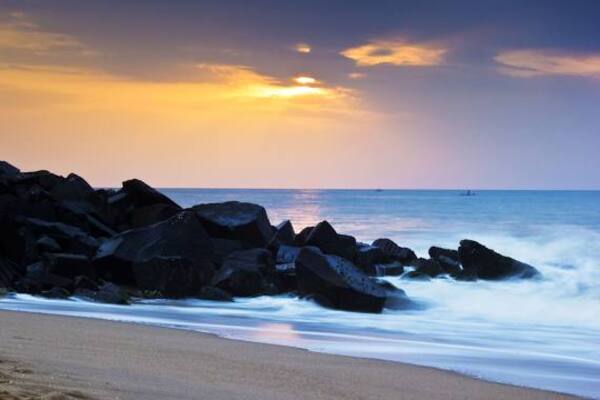 Coastal stretch with a seawall & a palm tree-lined promenade, popular for watching the sunrise.the popular stretch of beachfront in the city of Puducherry.